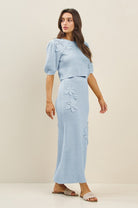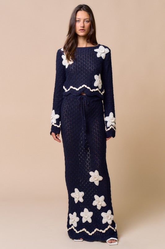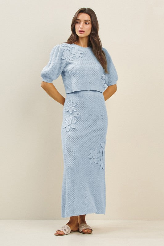 The Petal Knit Set features a beautifully textured knit adorned with dimensional 3D floral appliqués for a soft yet striking finish. Designed as a matching short-sleeve top and midi skirt, this set feels polished, feminine, and effortlessly wearable. Worn together or styled separately, it’s a standout look that still feels timeless.