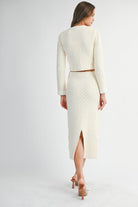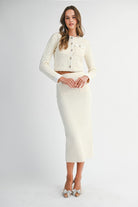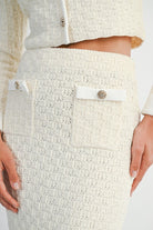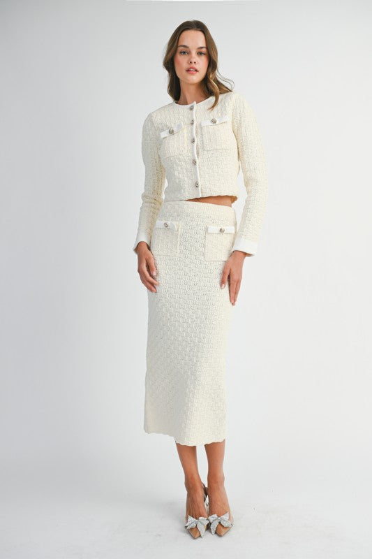 Elevated tailoring, reimagined. The Stardust Set brings timeless polish to modern wardrobes with a knit crop jacket and coordinating midi skirt. The long-sleeve jacket is finished with jewel buttons and a hidden inside closure for a refined fit, while the matching skirt skims the silhouette with ease. Crafted from a luxe lurex-blend knit of polyester, nylon, viscose, and metallic threads, this set channels classic Parisian elegance with a contemporary edge—your forever go-to for statement moments.