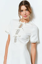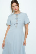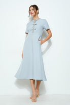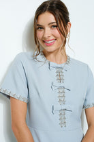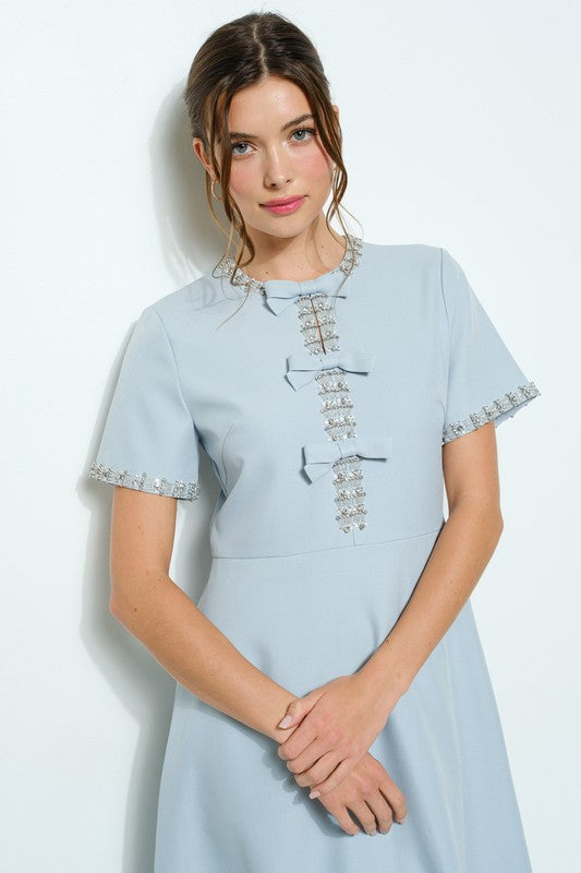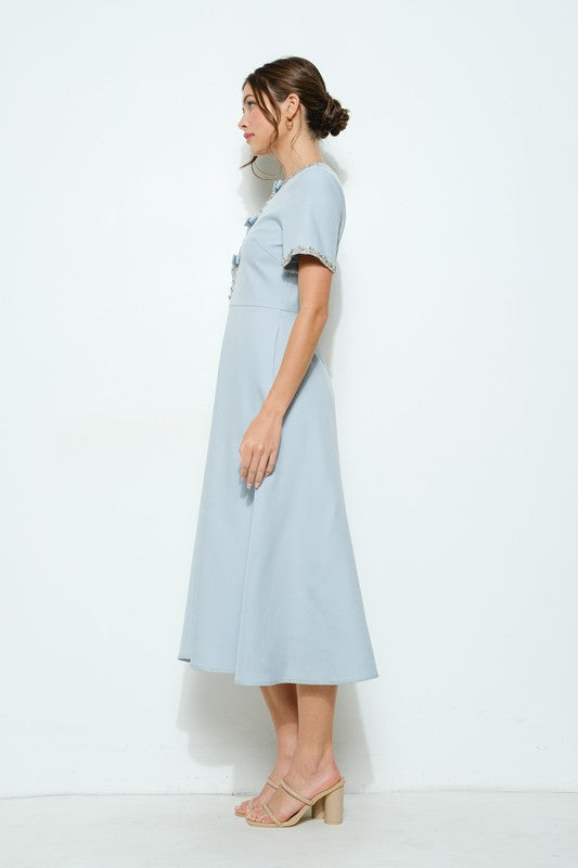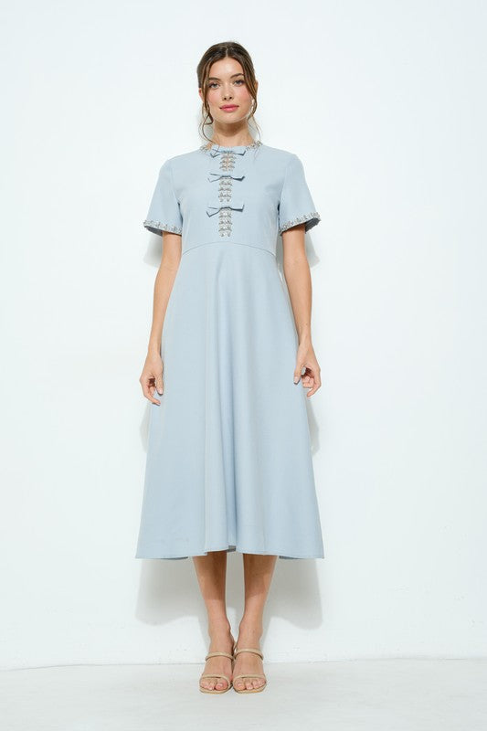 With its elegant design and charming details, the Short Sleeve Embellished Bow Midi Dress adds a touch of sophistication to any special occasion or dressy look. The embellished trims and bow accents offer a feminine touch, while the side pockets provide practicality. And with the back invisible zipper closure, this dress is both stunning and easy to wear.