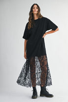 Reign Dress – bold, edgy, and effortlessly commanding. This oversized T-shirt style maxi dress features short sleeves and a sheer lace skirt overlay, blending street-cool comfort with high-fashion drama. Perfect for making a statement from day to night.
