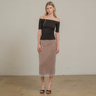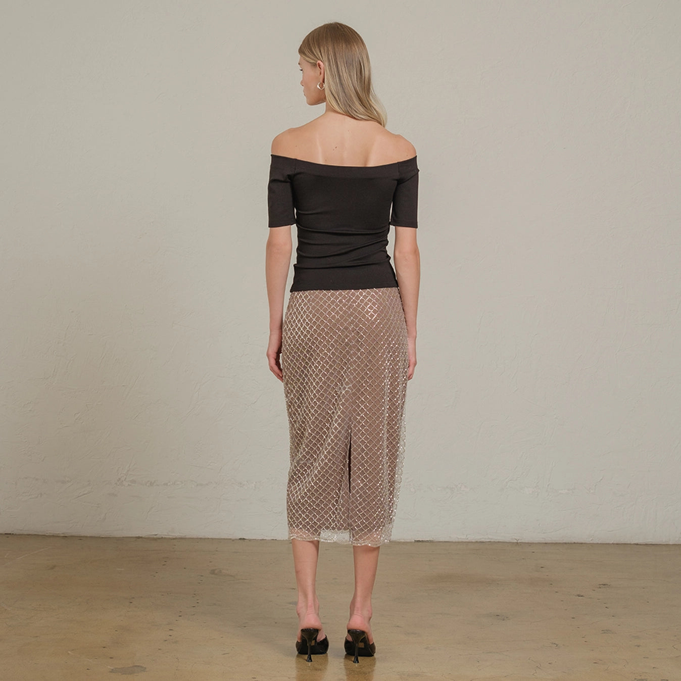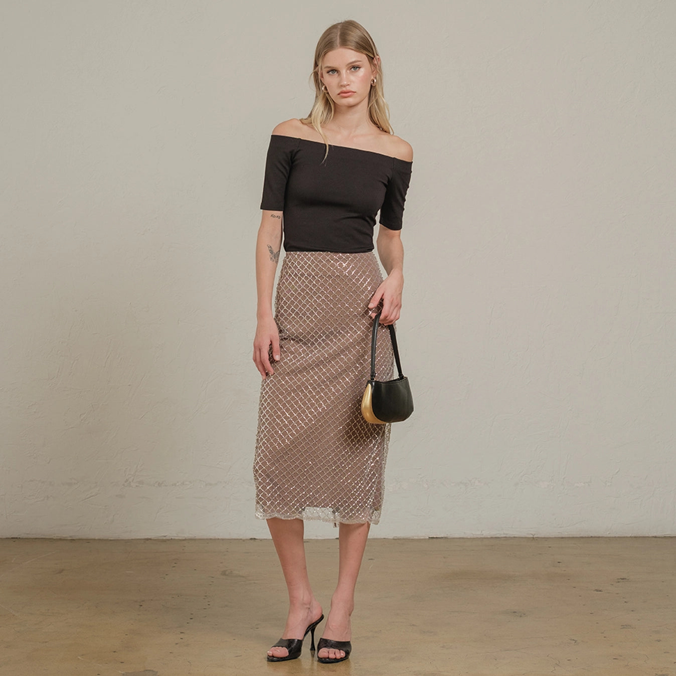 Elevate your evening look with a shimmer that feels both timeless and effortless. This beaded midi skirt drapes beautifully with every step, thanks to its intricate hand-inspired embellishment and soft woven lining. The silhouette is sleek, feminine, and versatile — perfect for styling with a fitted blouse, a cozy knit, or a dressy off-shoulder top. A touch of sparkle without going over the top — just enough to make heads turn.