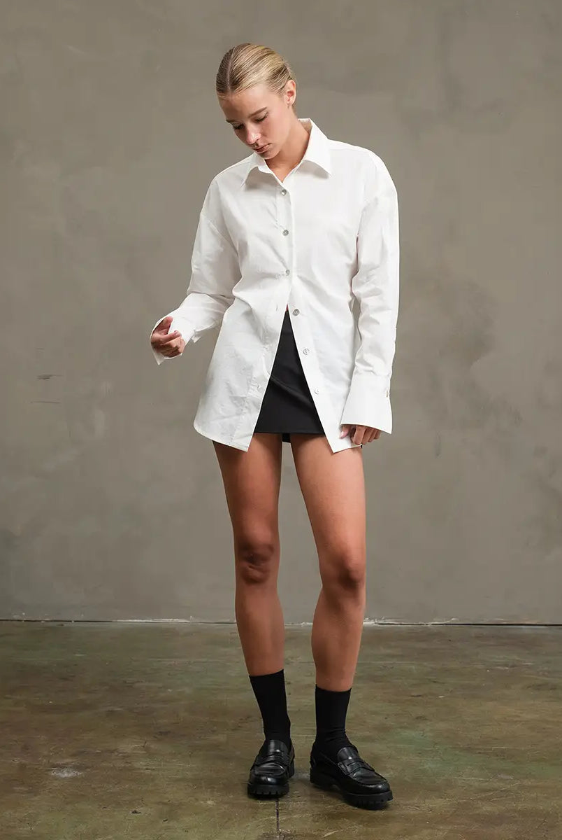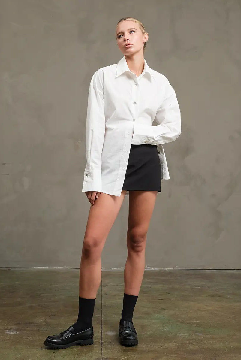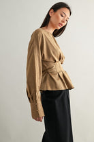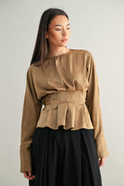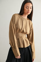 Modern structure meets timeless femininity. The Odette Blouse features soft pleating through the waist and a gentle peplum hem that flatters every silhouette. Designed with fluid drape, elegant long sleeves, and extended cuffs with gold button accents, it’s the definition of quiet sophistication. Effortless for day, polished for night — Odette brings understated drama to any look.