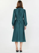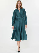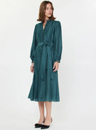 Effortlessly feminine, the Valencia Dress is defined by its graceful drape and subtle sheen finish. The split neckline features delicate self-covered buttons, framed by special handle binding at the neck and cuffs for an elevated touch. Long sleeves with elasticized cuffs keep the look easy and wearable, while a self-tie waist belt cinches the silhouette. Finished with a flared gored skirt, it moves beautifully with every step.
