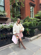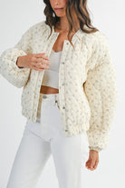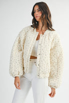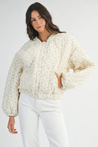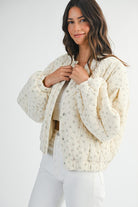 Bloom Jacket – playful, chic, and effortlessly stylish. This cropped quilted bomber jacket features a feminine floral print, long sleeves, and a front snap-button closure for easy wear. Fully lined for comfort, it’s the perfect statement piece to brighten up any outfit.