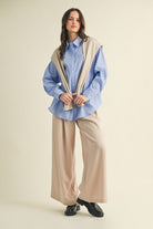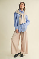 Classic stripes meet modern contrast. The Rowan Top blends a crisp cotton-striped shirt with soft knit sleeves, creating an easy, mixed-media piece that balances polish and comfort. Perfect for layering or wearing solo when you want subtle edge with everyday ease.