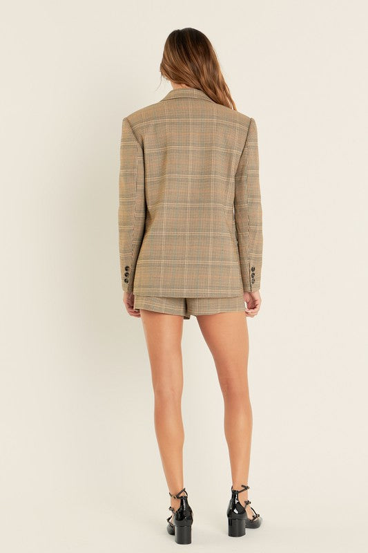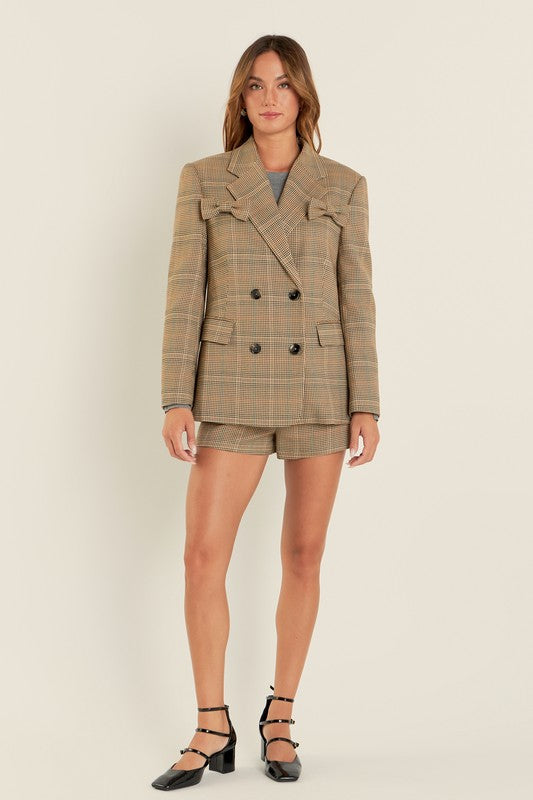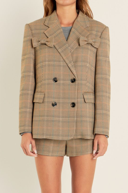 Glossy buttons punctuate a double-breasted blazer featuring bow details for a feminine touch and oversized lapels for sophisticated drama.