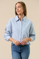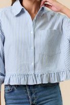 Sunshine-ready and effortlessly chic, The Palm Beach Shirt is a cropped button-down with crisp stripes and a flirty ruffle hem. Perfect for pairing with skirts, layering over dresses, or styling with your favorite high-waist pieces, it brings playful Palm Beach vibes to any look.