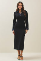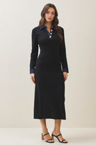 City polish meets modern texture — The Perry Knit Midi Dress blends classic structure with downtown ease. Featuring a polo-inspired collar with denim trim, gold button details, and a sleek ribbed knit body, it’s the definition of elevated everyday style. Soft yet refined, this mixed-media silhouette transitions effortlessly from brunch to evening.