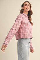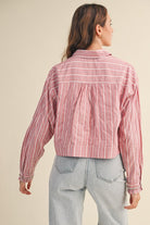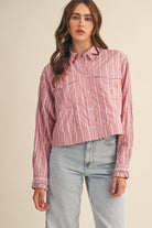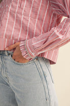 Classic stripes, turned up with a little sparkle. The Roxanne Top features a collared neckline, button-down placket, and front patch pockets—grounded in timeless shirting but reimagined with drop shoulders and puff sleeves for extra volume. The ruffled cuffs are traced with rhinestones for that unexpected glam touch, while the relaxed, boxy fit keeps it cool and effortless.