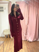 The Veronica Dress in variegated rib knit is all about subtle texture and thoughtful detail. Gold buttons line the front, while fitted sleeves flare into delicate flutter cuffs for a feminine finish. Midi length and a collared neckline keep it polished, making it perfect for everything from workdays to evening plans.