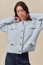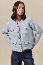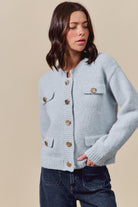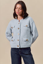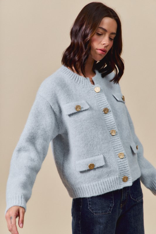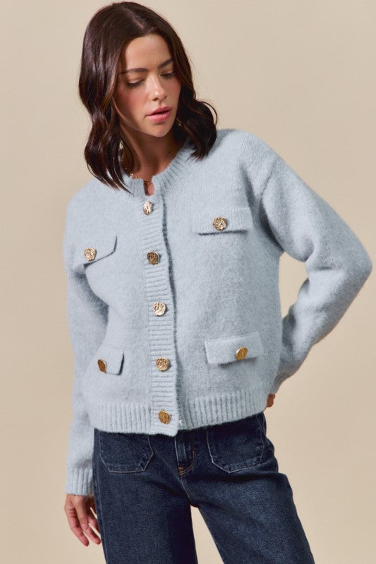 Classic with a modern edge. The Sterling Cardigan is defined by its sleek knit finish and luxe gold metal buttons, bringing instant polish to a timeless silhouette. Soft and versatile, it’s the layer you’ll style again and again—equally chic with skirts or draped over your favorite dresses.