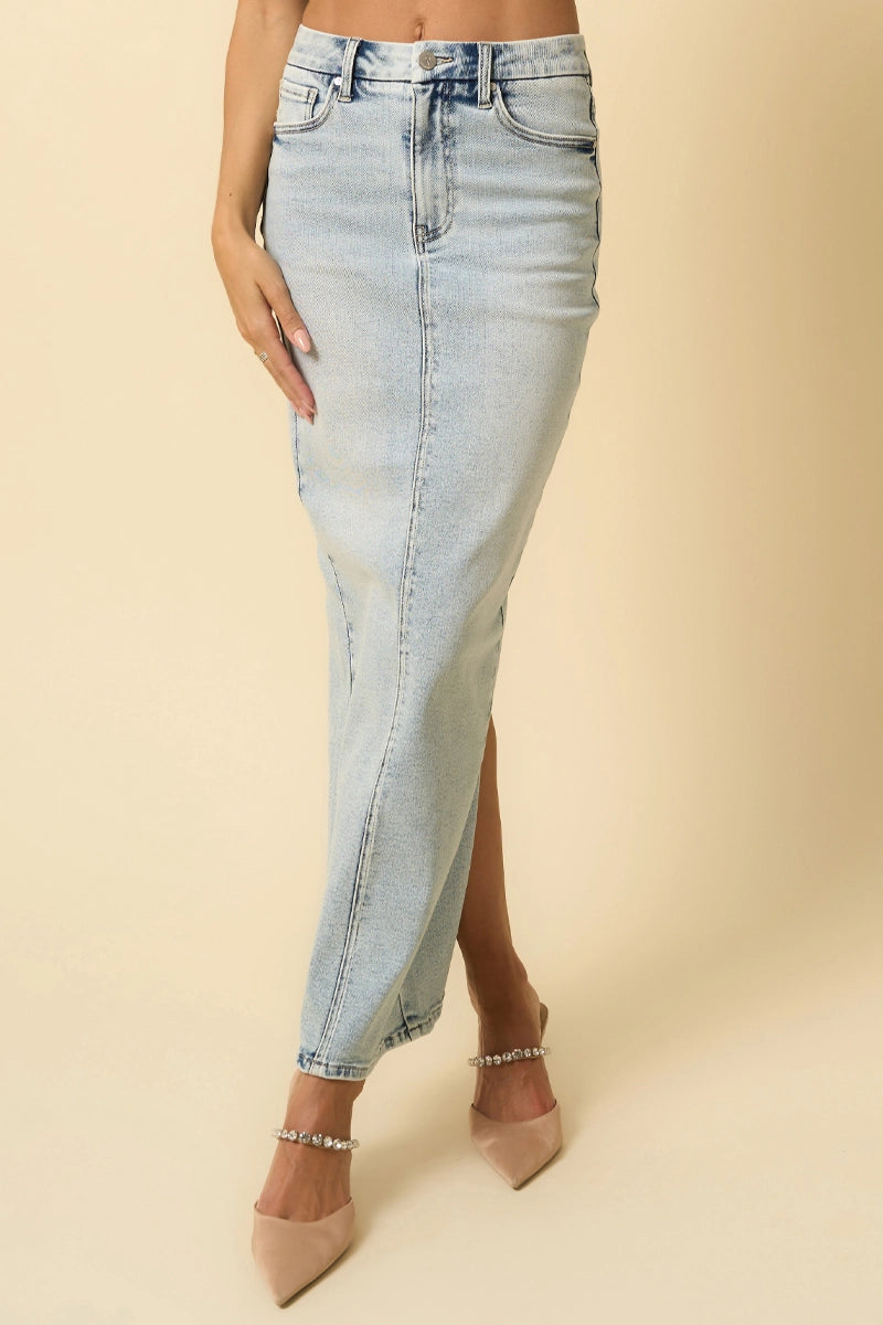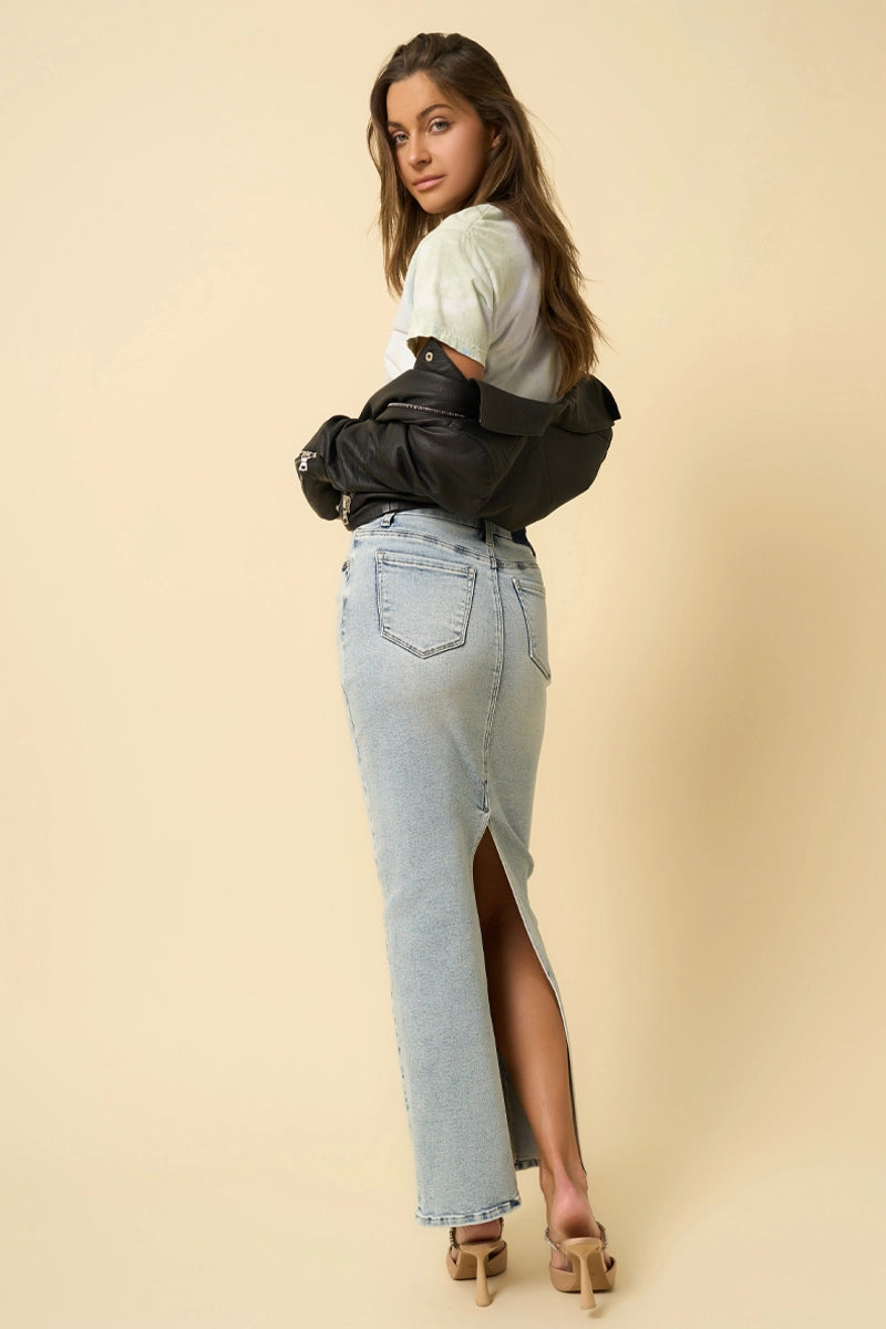 Easy, effortless, and endlessly wearable — the Del Ray Skirt channels that California-cool energy with a city-girl finish. Crafted in soft stretch denim, it skims the body in all the right places and moves with you thanks to its back slit. The faded wash and high-rise fit make it a year-round favorite — style it with anything from cropped tees to tailored blazers.