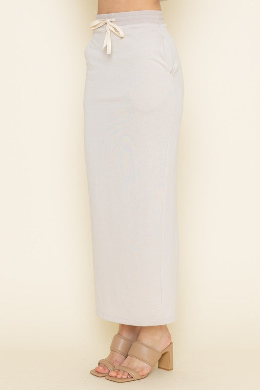 The Gramercy Skirt is your new NYC-cool staple — sporty, sleek, and effortlessly elevated. Designed in our signature soft athleisure fabric, it features a high elastic waist with a drawstring tie, functional pockets (because city girls need pockets), and a clean ankle-length silhouette finished with a subtle back slit for movement. Comfortable enough for all-day errands, polished enough for a coffee date, and chic enough to dress up with literally anything.