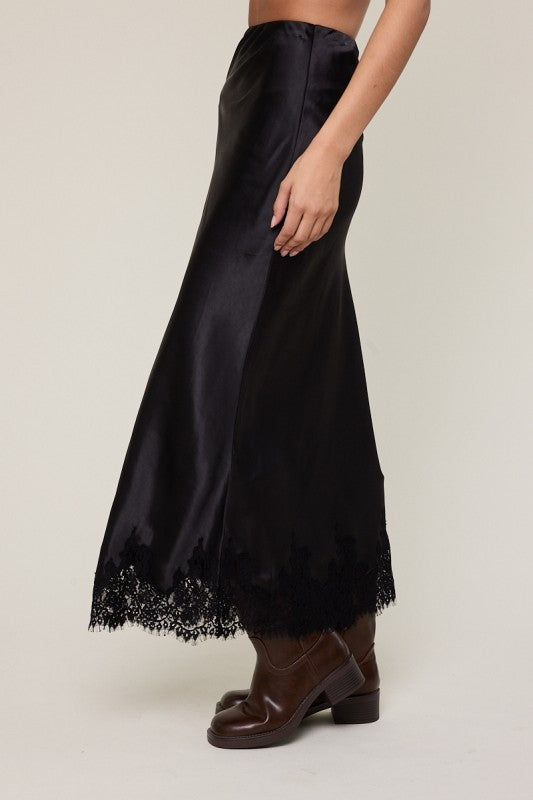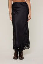 Elegant, effortless, and endlessly wearable — The Gwenyth Midi Skirt combines modern ease with timeless sophistication. Crafted from smooth satin in a tonal finish, it’s detailed with delicate embroidered lace down the front for a subtle touch of romance. An elastic waistband ensures comfort, while the fluid midi silhouette drapes beautifully with every step.
