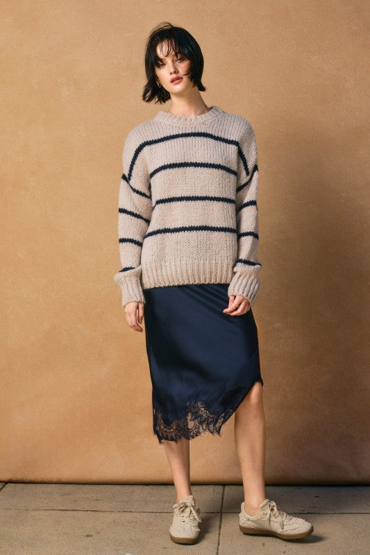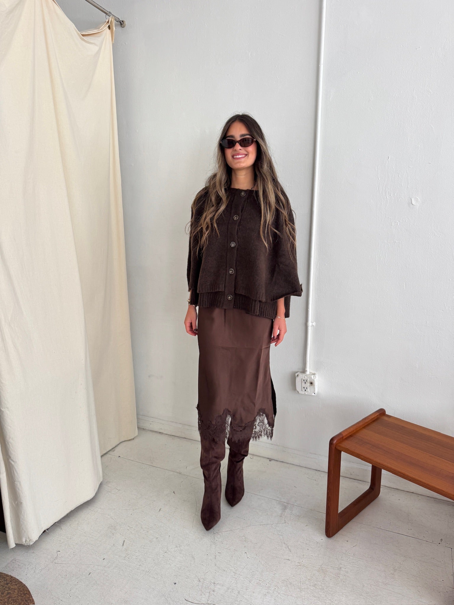 Effortless elegance meets everyday comfort. The Luma Midi Skirt drapes beautifully in a silky satin A-line, finished with a delicate lace hem and side slit. Fully lined and easy to pull on with its elastic waistband, it’s the kind of skirt you’ll reach for again and again—twirl-ready for wherever the day takes you.