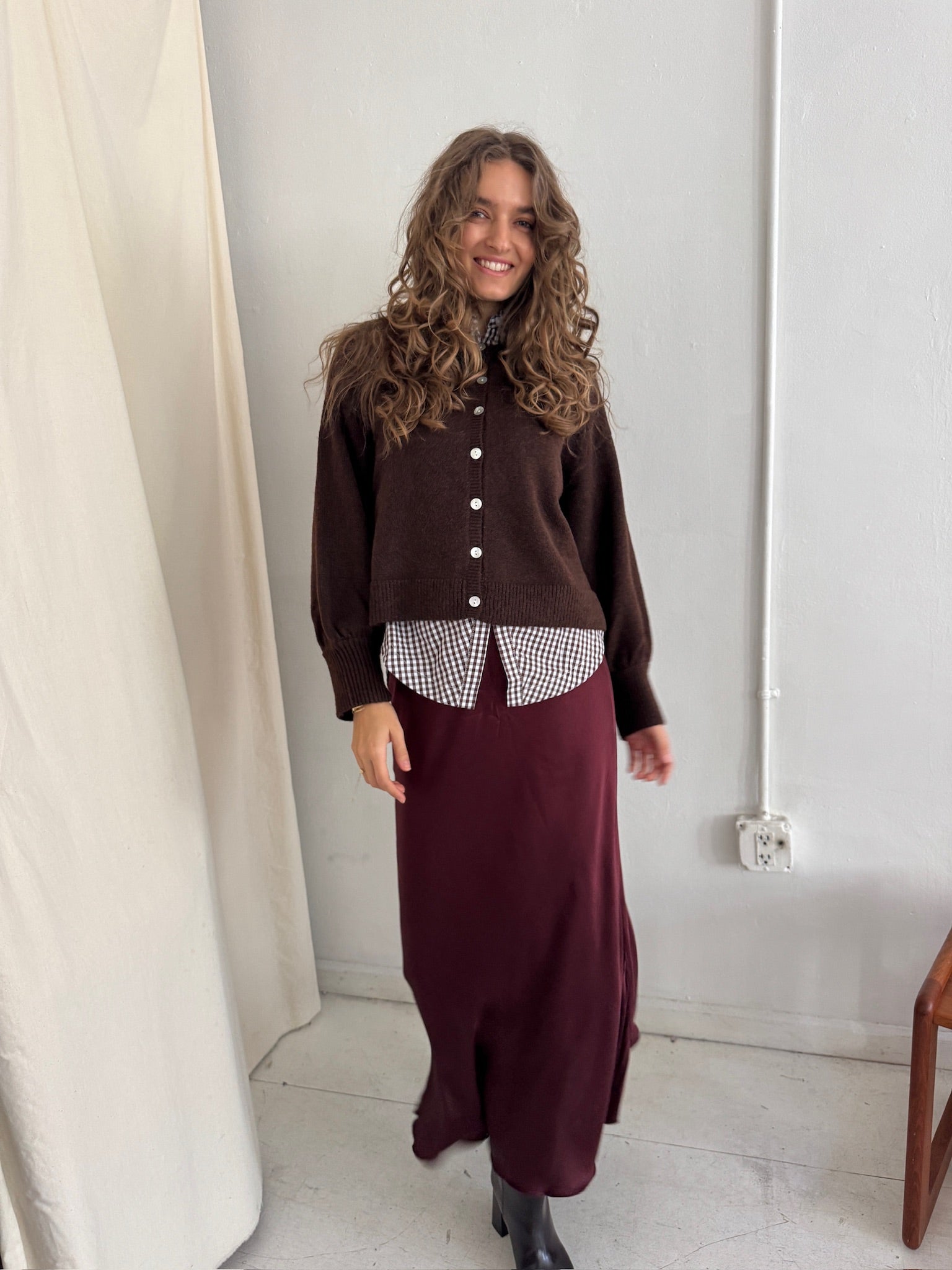 Our Sloane Satin Slip Skirt glides effortlessly with every step. Designed with a bias-cut silhouette that flatters the figure and moves with a soft, liquid-like drape. Finished with a clean waistband, subtle sheen, and elastic trim for a perfect pull-on fit — easy to dress up or down, day to night.