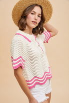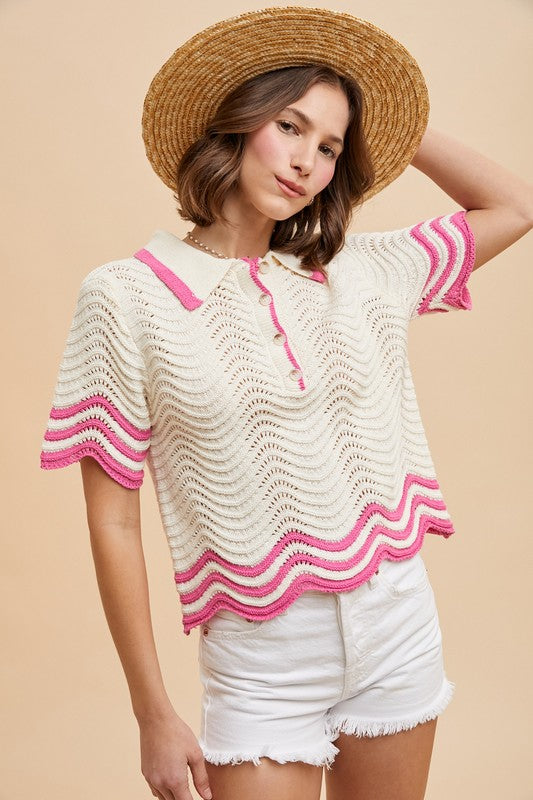 Preppy, playful, and effortlessly chic. The Mari Sweater features a striped wave pointelle pattern, a collared neckline with subtle placket, and short sleeves for a relaxed, modern fit. Crafted from a soft cotton-acrylic blend, it’s perfect for layering or wearing on its own for an elevated, everyday look.