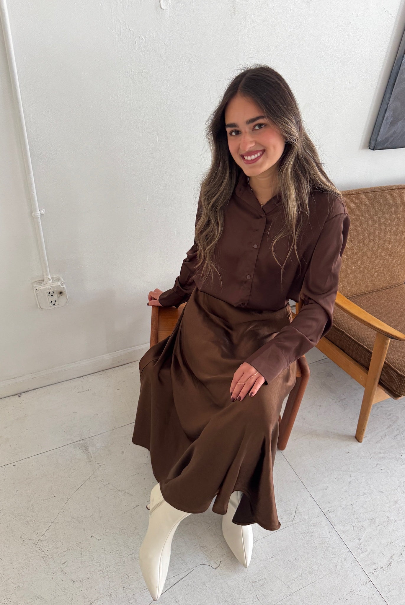 Sleek, polished, and effortlessly versatile — The Amara Silky Button-Down is a modern essential. Crafted from smooth, fluid fabric with a subtle stretch, it drapes beautifully while offering comfort and ease. Perfect tucked into high-waisted bottoms, layered over skirts, or paired with its coordinating Amara Skirt for a chic, head-to-toe look.