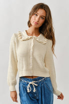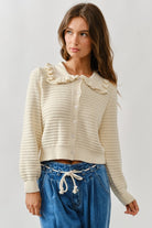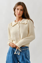 Sweet with a modern twist. The Ruffle Collar Knit Cardigan features a Peter Pan–inspired ruffle neckline for a soft, feminine touch. Designed in a cozy knit with a relaxed fit and full button-down front, it’s the perfect mix of polished and playful. Finished with ribbed cuffs and hem for that effortless Jupe feel.