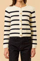 Make a statement in cozy style with this bold striped sweater cardigan, featuring luxe gold button details for an elevated finish. The classic button-down design is reimagined with vibrant stripes and a flattering, slightly relaxed fit-perfect for layering over your favorite basics or wearing as a standalone top.