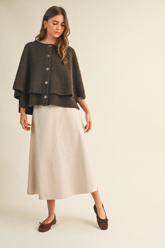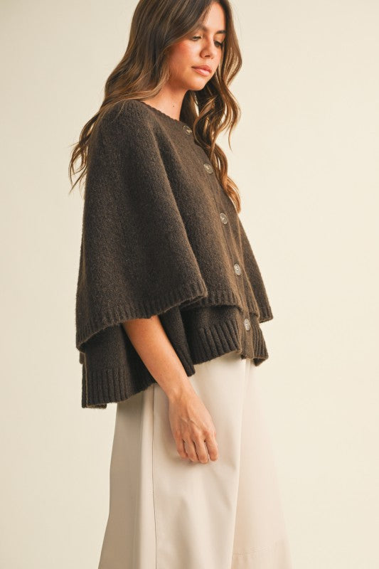 Effortless, cozy, and fashion-forward — The Fiona Sweater Cape Cardigan redefines layering. With a chic button closure and draped cape silhouette, it offers warmth without compromising style. Crafted from a soft, slightly stretchy knit blend, it’s perfect over fitted tops, or dresses for an elevated, relaxed look.