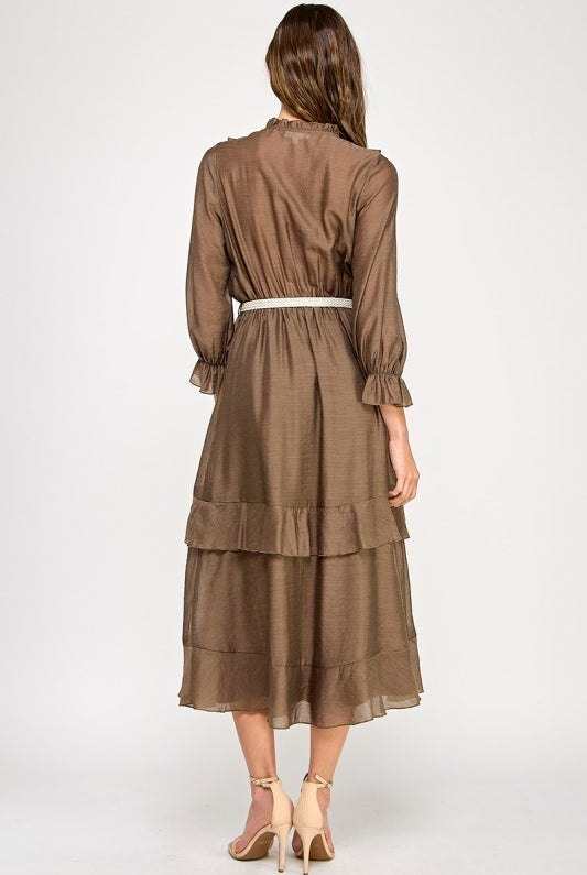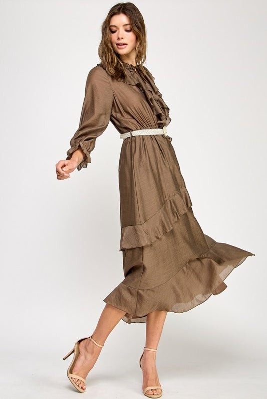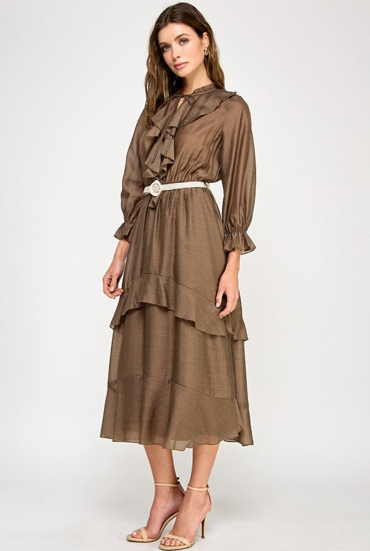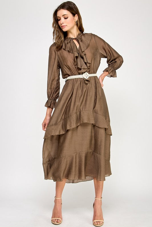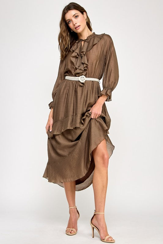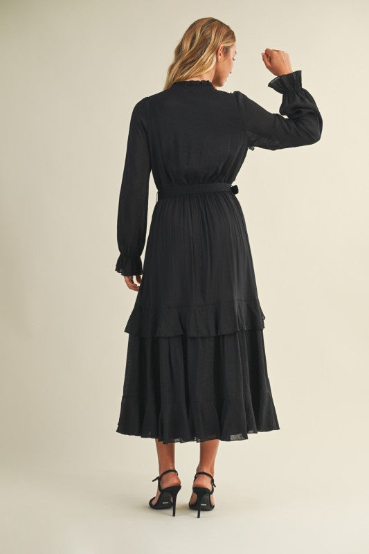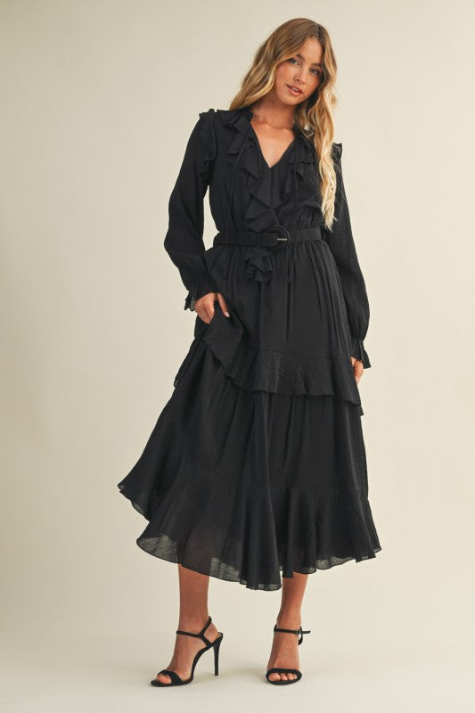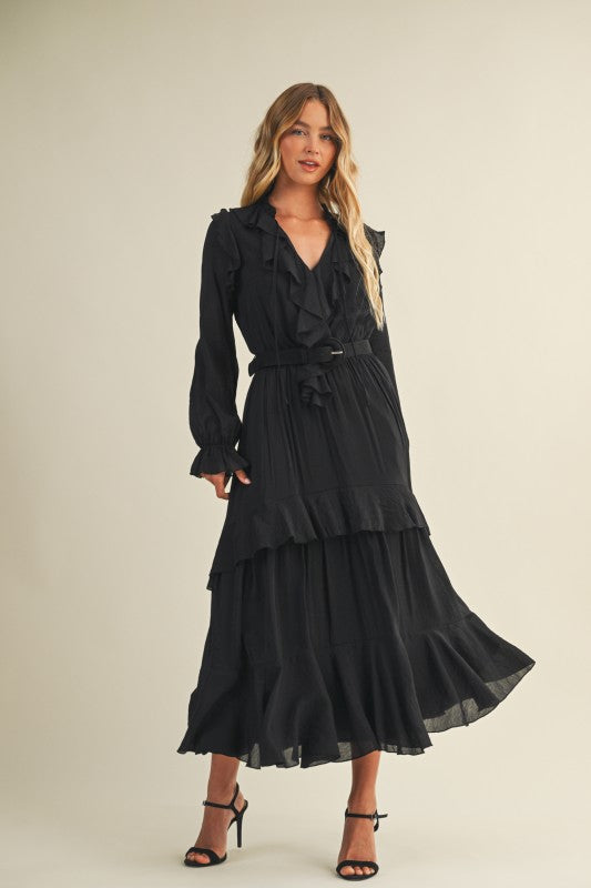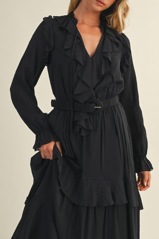 Romantic yet refined, the Seraphine Maxi Dress brings effortless drama to your wardrobe. Designed with cascading ruffles, a belted waist, and flowing long sleeves, it’s the perfect piece to take you from day to evening in timeless style.