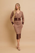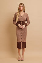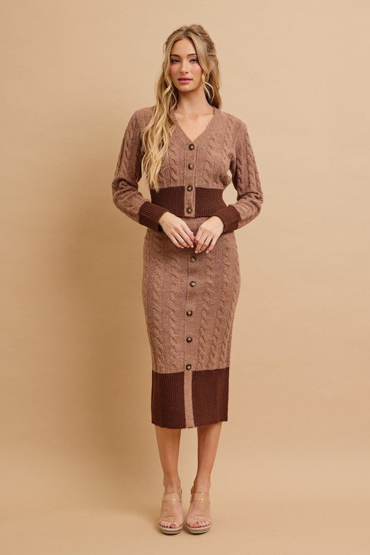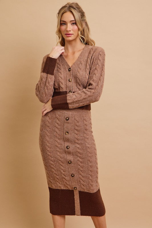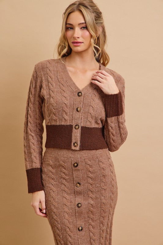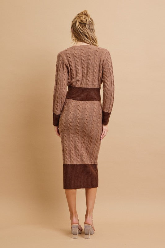 Cozy meets chic in The Winslet Set. This cable-knit cardigan and matching midi skirt pair features playful colorblock detailing and soft stretch-knit fabric for comfort and style. Wear it together for a polished, coordinated look or style the pieces separately for versatile, elevated outfits.